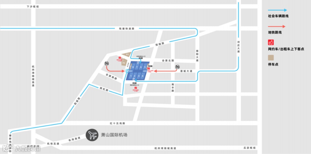导航至“杭州大会展中心2号口、5号口”,通过钱塘快速路(钱塘过江隧道)、杭绍甬高速(红十五线)、河庄大道三条线路前往,车辆停放至杭州大会展中心地下停车库。