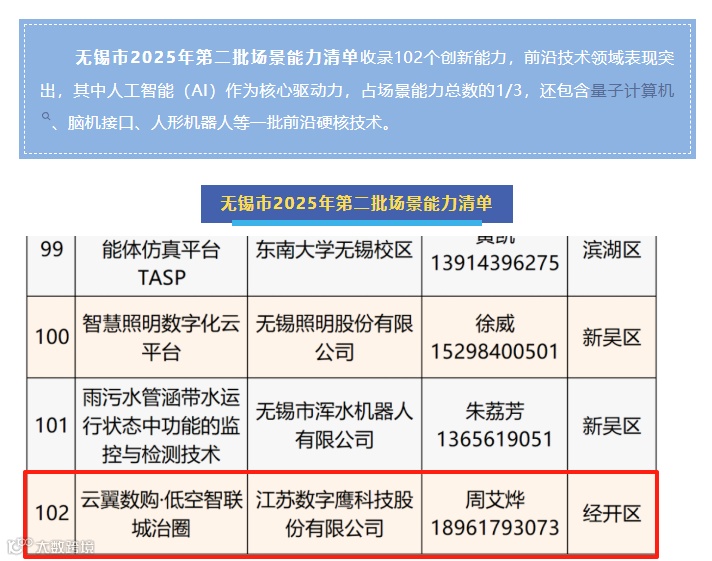 在无锡市“无限锡引,焕新未来” 超级场景发布暨场景创新供需对接活动里,江苏数字鹰凭借 “云翼数购・低空智联城治圈” 成功入选场景能力清单。