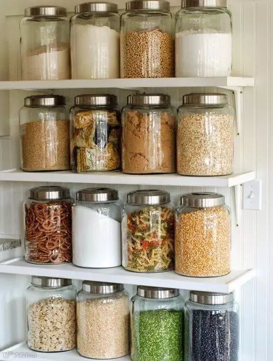 糖、盐、还有各种调料和谷物等,可以用瓶瓶罐罐装起来,放在搁板上或者抽屉里,防潮同时拿取也方便。
