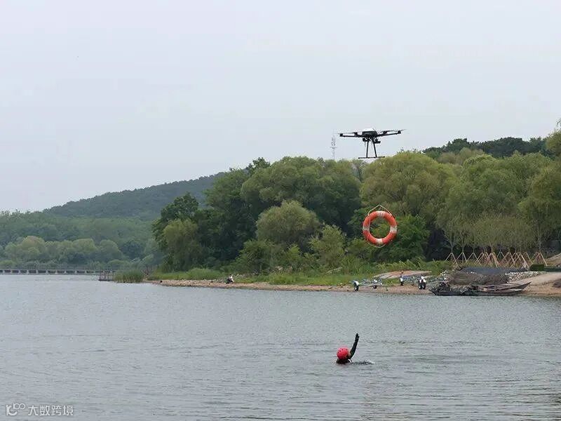 使用无人机搭载抛投器,挂载救生圈和牵引绳,将救生圈投递至被困人员,救援人员拉动牵引绳即可将被困人员救起。使用牵引救生设备,能在一定程度上避免救援人员以身犯险。