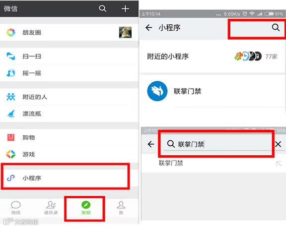 通过微信首页搜索框或者发现—小程序搜索框搜索 “联掌门禁” 进入小程序。