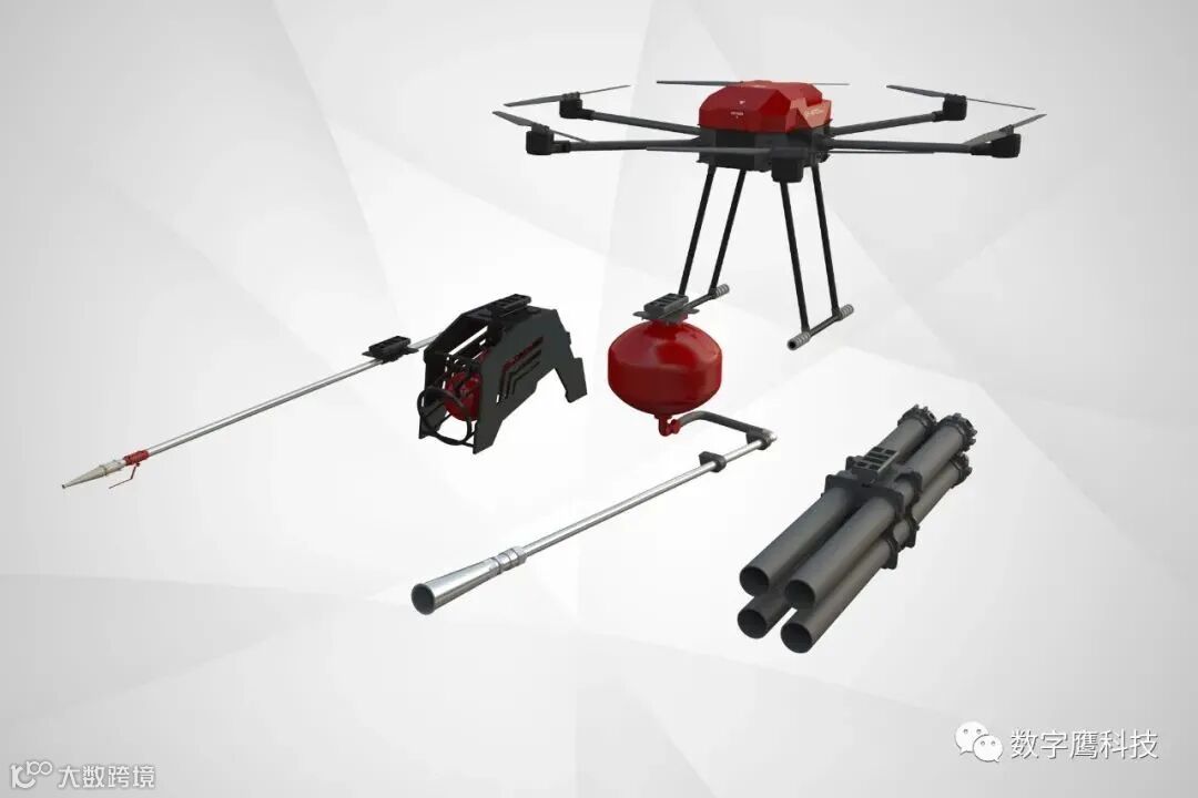 数字鹰作为少数拥有独立开发无人机飞行控制系统技术的综合性高新技术企业,公司研发的SK-XF07消防救援无人机适用于城市高层建筑或特定区域范围内的灭火,整个系统由无人机、发射器、灭火弹组成,可一次性搭载4枚灭火弹,发射器由专用支架固定悬挂于无人机腹部,由无人机操控人员控制瞄准与发射。