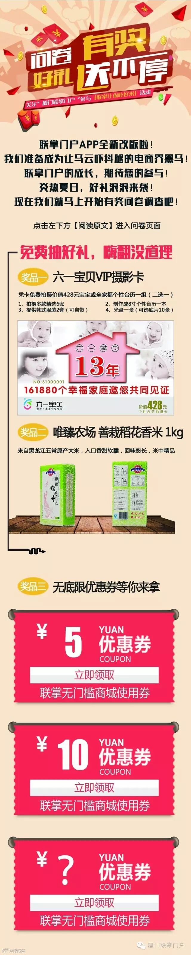 导读:联掌门户APP全新改版啦!我们准备成为让马云吓抖腿的电商界黑马。联掌门户的成长,期待您的参与!炎热夏日,好礼浪浪来袭,现在我们就马上开始有奖问卷调查吧!