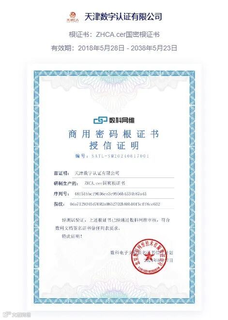 近日,天津数字经济产业集团旗下天津CA成功申请列入数科受信根证书列表。这标志着天津CA国产化适配能力进一步提升,能够更好地响应政企客户国产化需求,为政企电子文档签名应用、无纸化办公应用等场景,提供可靠的国产化电子文档签名方案。