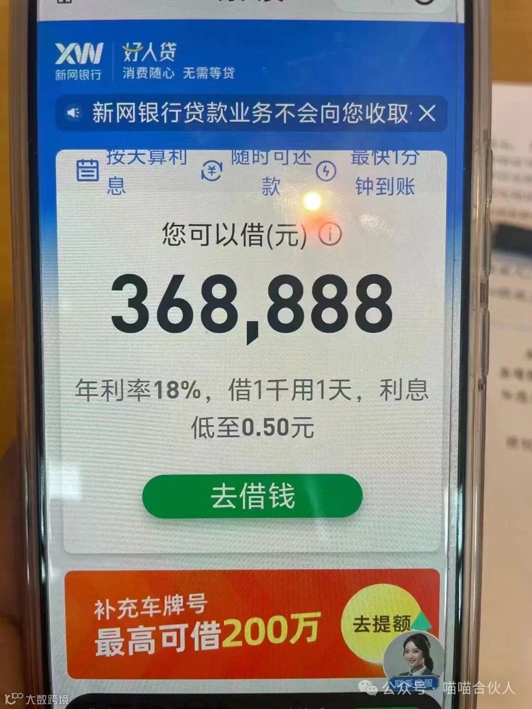 喵喵合伙人好人贷是“四川新网银行”推出的大额云贷款产品,随时随地操作,最高可借100万。好人贷采用纯信用贷款的模式,无需借款人提供抵押和担保,有简单的个人资料就可以申请。下面小编为大家详细介绍一下新网好人贷的产品大纲。
