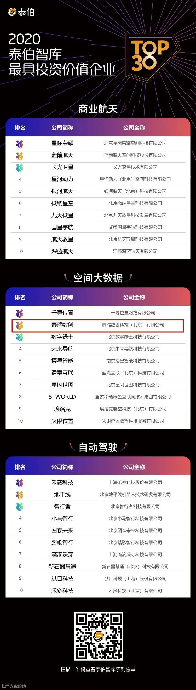 进度、投资机构等多维度出发,经13位资深专家学者及知名投资机构严格评分,最终泰瑞数创于千余家企业中脱颖而出,夺得空间大数据最具投资价值企业第二名的好成绩。