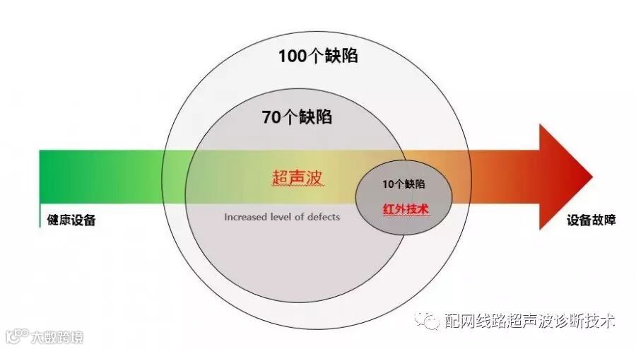 与红外相比,超声检测主要检测电气放电类的缺陷,可在缺陷发生的初级阶段就能检测出来,并早做关注及预防,下图是对红外检测与配网超声检测的一个形象说明:对于配网网的缺陷,超声检测大概能检出其中的70%左右,而红外检测只能检出其中的10%左右。