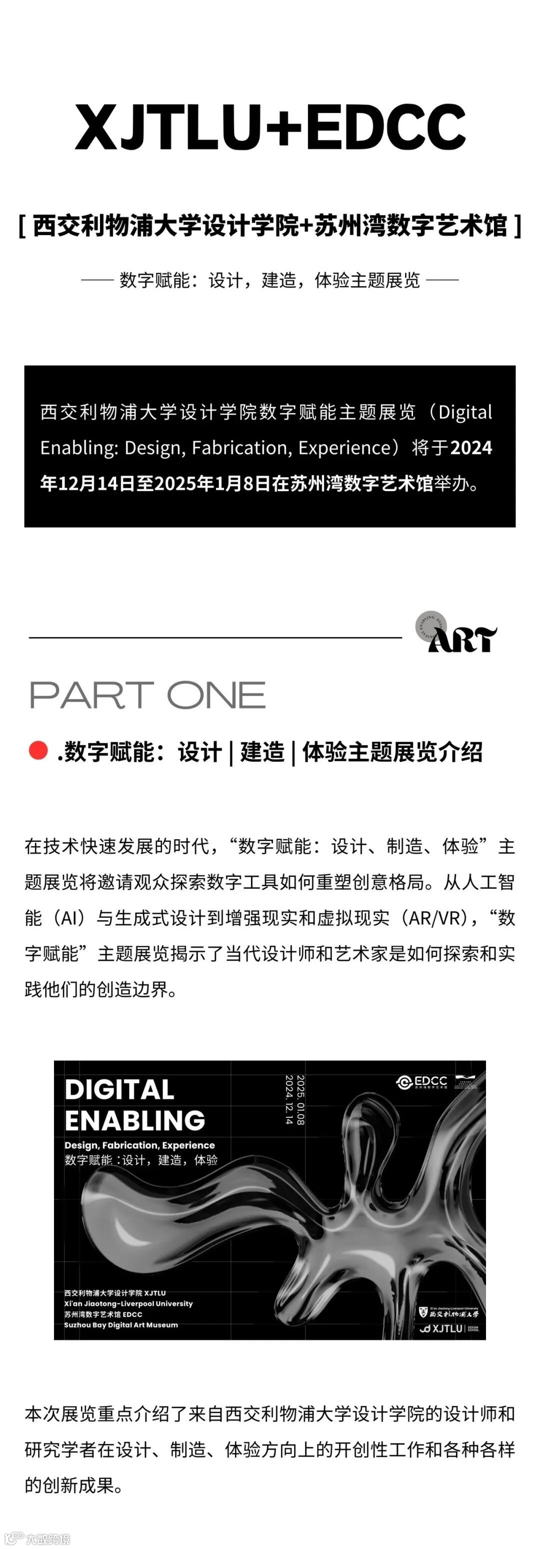 西交利物浦大学设计学院数字赋能主题展览于2024年12月14日至2025年1月8日在苏州湾数字艺术馆举办。在技术快速发展的时代,“数字赋能:设计、制造、体验”主题展览邀请观众探索数字工具如何重塑创意格局。从人工智能(AI)与生成式设计到增强现实和虚拟现实(AR/VR),展览揭示了当代设计师和艺术家是如何探索和实践他们的创造边界,可在文末进行免费预约。