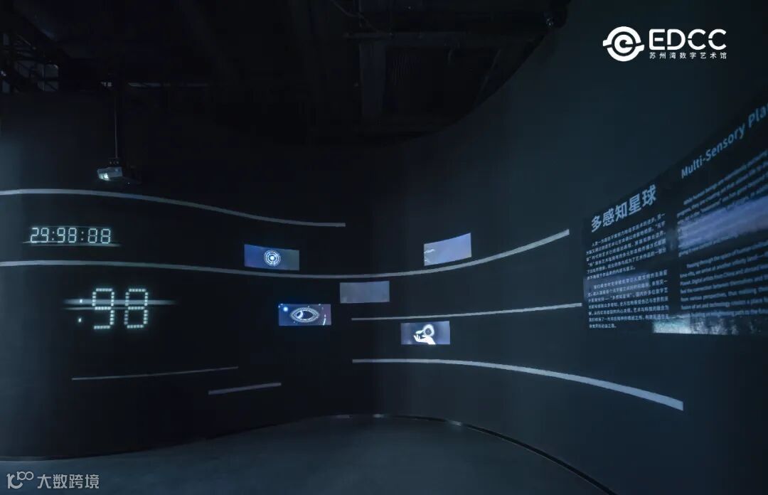 《时间缝隙》在展览中是承上启下的过渡空间,它作为功能空间,可以让观众阅读序言,了解策展主题与内容,同时也结合黑暗的环境,引领观众穿越时空开始多感知体验。以抽象化的视觉表现,通过五感感知艺术。