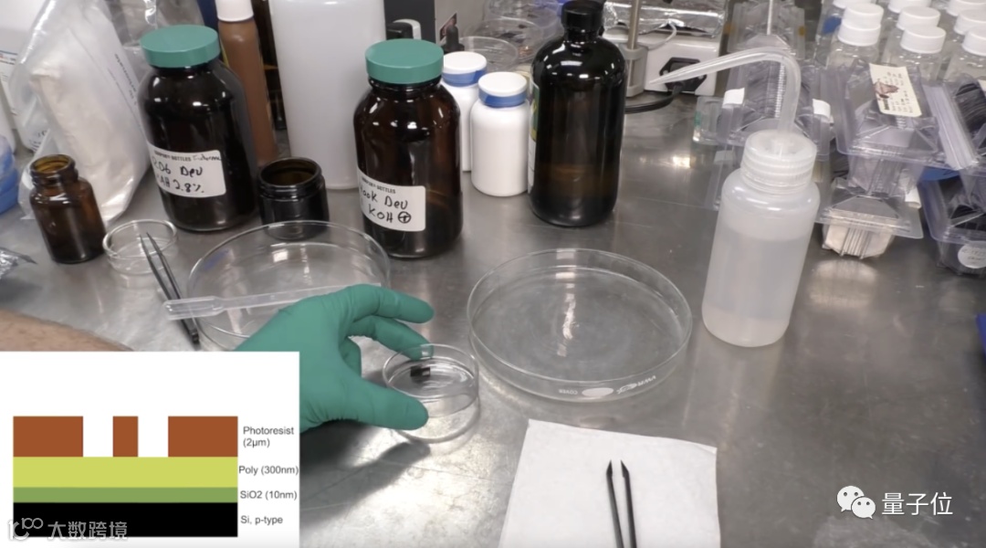 之后在显影步骤中,Zeloof把晶圆浸泡在氢氧化钾溶液中大约1分钟时间。