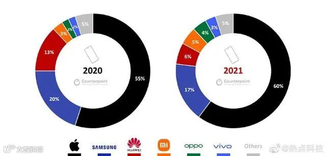 oint Research的Market Pulse Service数据,2021年全球高端手机(批发平均售价超过400美元)华为市场份额从13%降至6%,而苹果则从55%市场份额提升到60%。