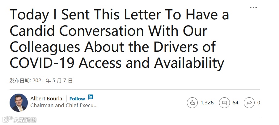 美国辉瑞公司CEO于2021年5月曾发表公开信反对专利豁免