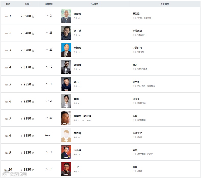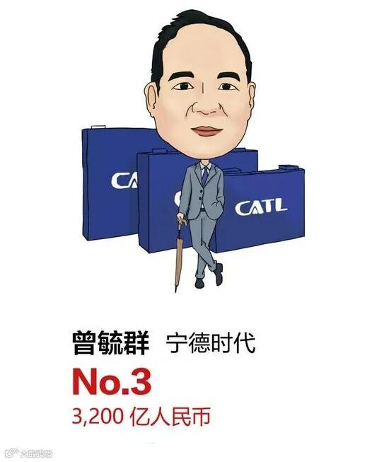 53 岁的曾毓群财富增长至去年的近3 倍,即增长了 2,000 亿元,以 3,200 亿元首次进入前三,比去年上升 21 位。宁德时代是过去一年中 A 股市场最受关注的上市公司之一,市值较去年同期增长 150%,目前超过 1.2 万亿元,是创业板市值最大的公司。今年上半年,宁德时代完成销售额 440 亿元,净利润达到 53 亿元。宁德时代位列今年胡润世界 500 强第 50 名。宁德时代今年共有 7 位股东上榜。