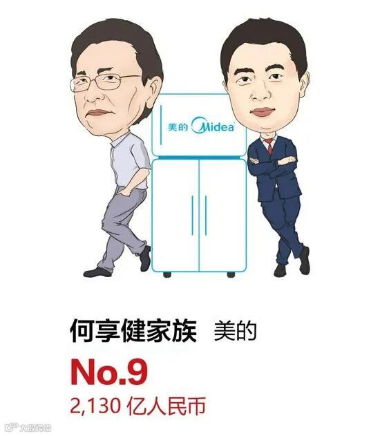 79 岁的何享健及其家族财富比去年下降 120 亿元,以 2,130 亿元位列第九,比去年下降三位。对比今年最高峰时,何享健家族财富下降了 700 多亿。受疫情影响,去年全年美的实现营业收入 2,857 亿元,同比增长仅 2.3%。今年上半年在面对原材料价格上升的情况下业绩显著回升,实现营业收入 1,748亿元,同比增长 25%。目前,美的覆盖消费电器、暖通及楼宇系统、机电事业群、机器人与自动化、数字化创新五大业务板块。在全球“缺芯”危机背景下,美的旗下的美仁半导体针对小家电行业智能化发展趋势,重点研发覆盖家电芯片全品类的产品系列。美的位列今年胡润世界 500 强第 198 名。何享健家族以63 亿元的捐赠额位列今年胡润慈善榜第二位。美的今年共有 5 位股东上榜。
