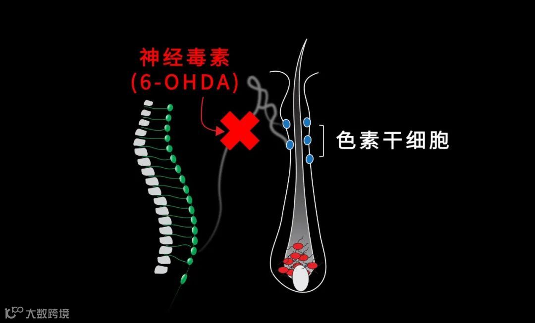 到目前为止我们就有点抓狂了,因为这两种其实都是以前大家认为精神压力导致白发的假说,结果我们验证了事情并不是这样的。那就还有第三种可能,会不会是交感神经系统?