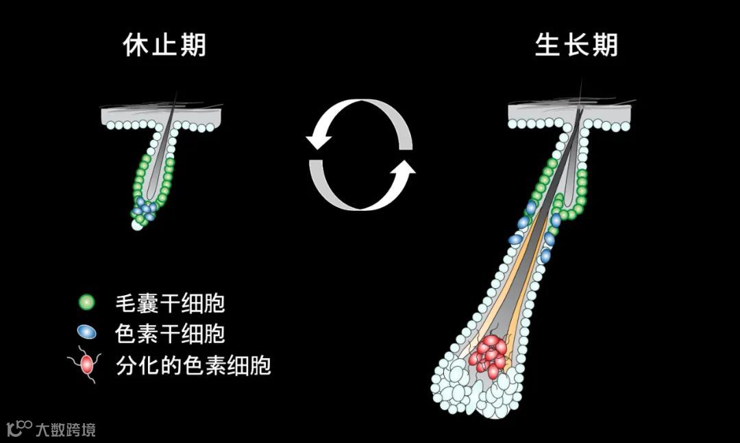 为什么这个问题很重要,大家想一想,如果你有干细胞的话,即使色素细胞没有了,到下一轮毛囊周期的时候,你还是可以生成色素细胞,头发还有机会上色。但如果你的色素干细胞没了,就不可能再产生这种分化的色素细胞了。也就是说,不管再怎么长,这头发永远都是白色的了。