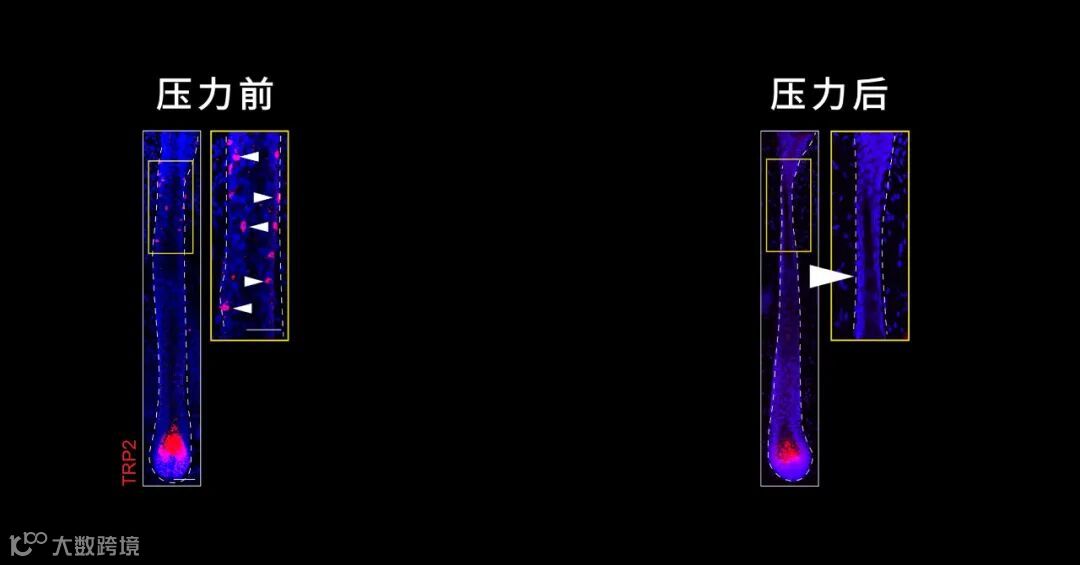 我们做了一个很简单的实验。这是我们实验室非常常见的技术,叫做免疫荧光染色。这是显微镜下的照片,上面那些红色点状的就是色素干细胞,下面这一团红色的就是成熟的分化的色素细胞。然后我们就给小鼠施加压力,看它到底影响的是哪一种细胞。