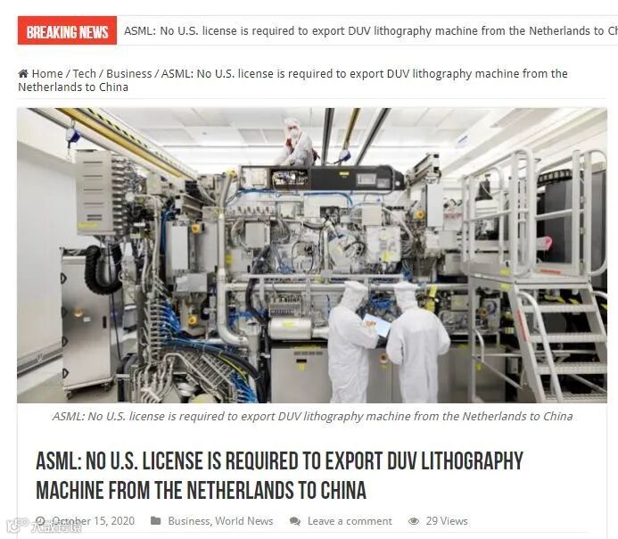 ASML 可以从荷兰向中国出口 DUV(深紫外)光刻机,无需美国许可。