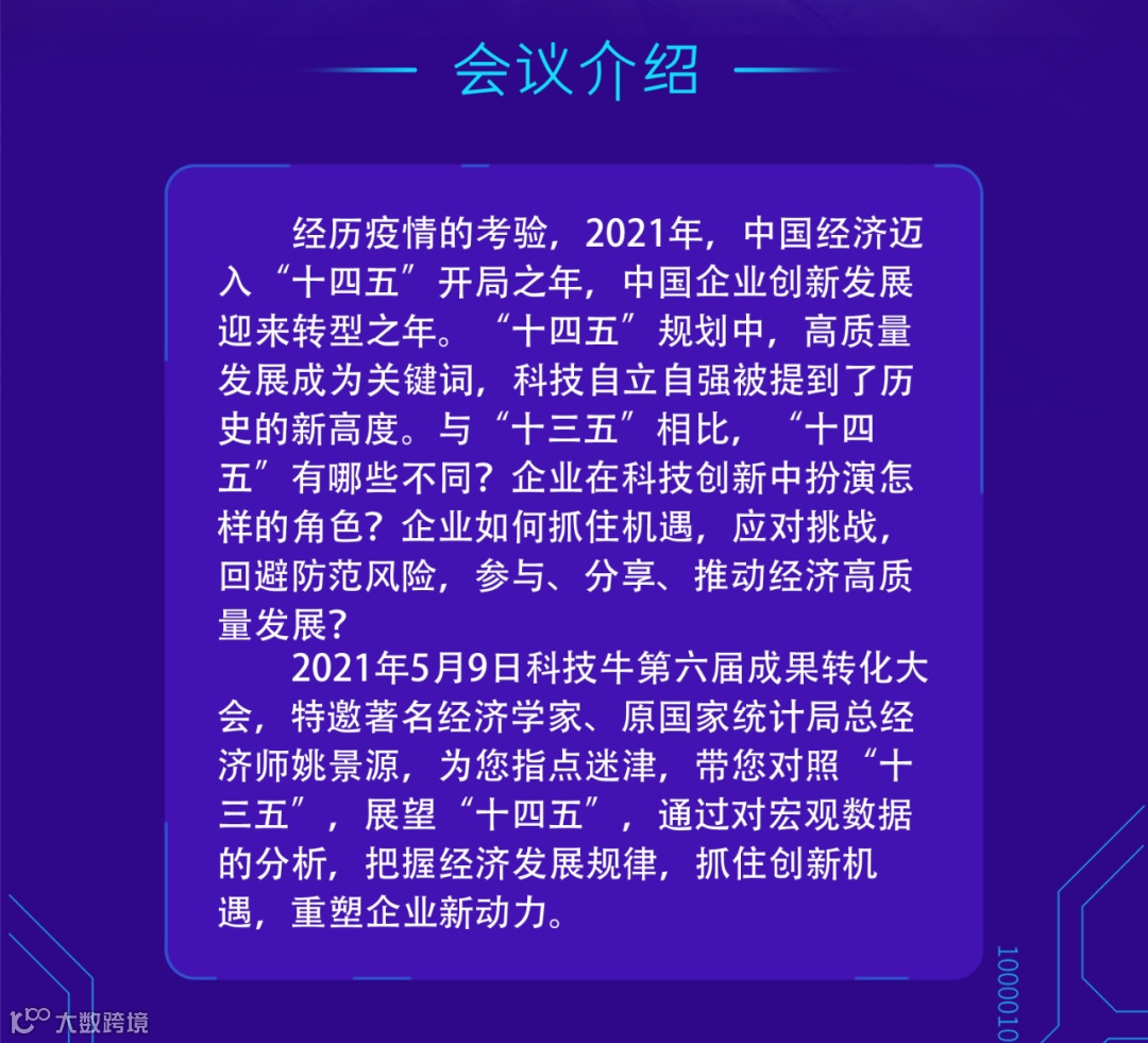 导读:2021年5月9日科技牛第六届科技成果转化大会,特邀著名经济学家、原国家统计局总经济师姚景源,为您指点迷津,带您对照“十三五”,展望“十四五”,通过对宏观数据的分析,把握经济发展规律,抓住创新机遇,重
