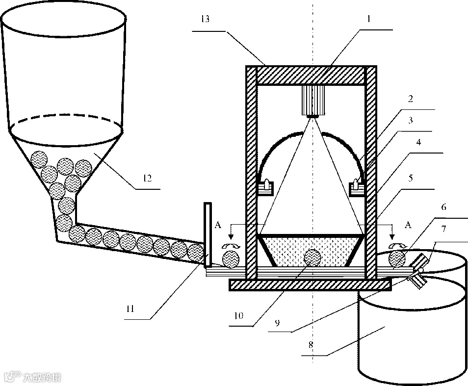 轴承是机械基础部件,钢珠作为滚动球轴承的关键零件,其几何形状、大小和表面缺陷直接影响轴承精度、动态性能和使用寿命。目前,国内多数钢珠生产厂家仍采用人工目视的方式对钢珠进行检测,大量的检 测人员在白炽灯下用目视的方法对钢珠进行检测,并对其进行简单的分选。这种方法误差 大而且容易受到个人主观因素的影响,不同的检测人员的检测差别较大. 机器视觉检测法针对目前我国钢珠制造业最迫切、最需要解决的问题,将机器视 觉检测技术运用到钢珠生产线上。左右两侧对称设置有安装在左支架上的左侧摄 像机和安装在右支架上的右侧摄像机,左、右侧摄像机的镜头对称设置且分别与形成在光 源碗罩上的左观测孔和右观测孔相对应设置。该方案是尝试通过多个摄像机来获取钢珠所 有表面图像,因此存在着多个摄像机的同步控制问题,同时会增加检测装置的成本和体积。为了克服已有的基于机器视觉的钢珠实时检测和分选系统的机构复杂、制造成本 高、检测与分选效率低、使用和维护困难等不足;本技术提供一种具有机构简单、制造成本 低、分选效率高、使用和维护方便的基于单目多视角机器视觉的钢珠在线自动分选装置。