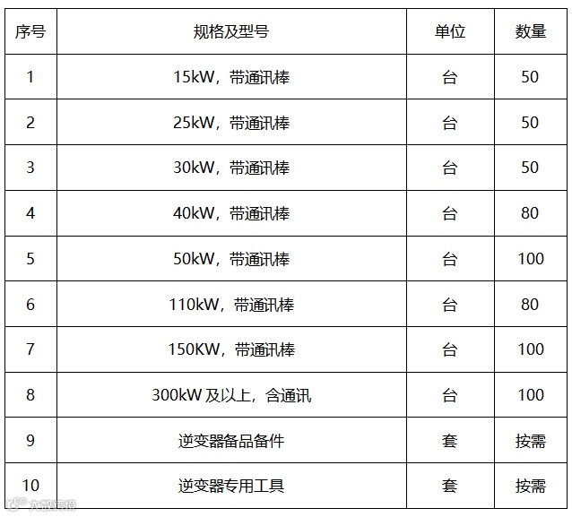 3、业绩要求:自2021年1月1日至投标文件递交截止时间(以合同签订时间为准)逆变器累计供货合同业绩不低于1000MW,提供至少5个与投标逆变器相同或相近型式的逆变器供货容量大于等于100MW的供货合同(关键页合同封面、供货范围、签订时间、签字盖章页)及对应的加盖用户盖章的到货签收单(或投运证明或质量验收证明)。