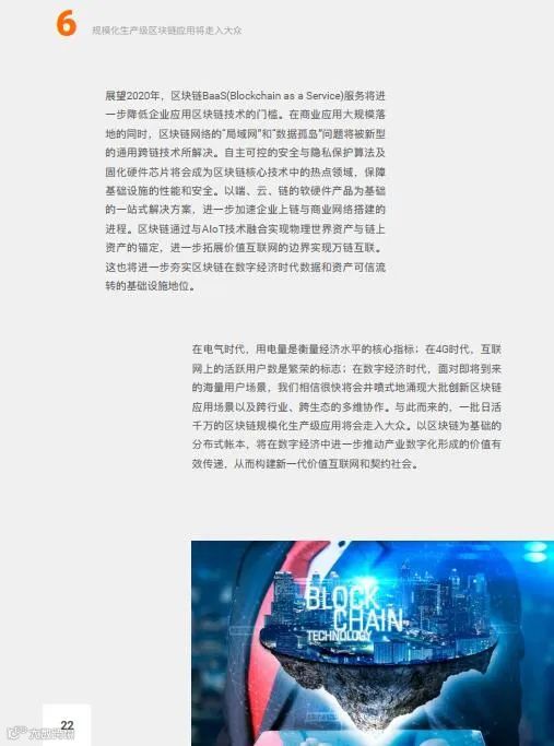 【趋势概要】区块链BaaS(Blockchain as a Service)服务将进一步降低企业应用区块链技术的门槛,专为区块链设计的端、云、链各类固化核心算法的硬件芯片等也将应运而生,实现物理世界资产与链上资产的锚定,进一步拓展价值互联网的边界、实现万链互联。未来将涌现大批创新区块链应用场景以及跨行业、跨生态的多维协作,日活千万以上的规模化生产级区块链应用将会走入大众。