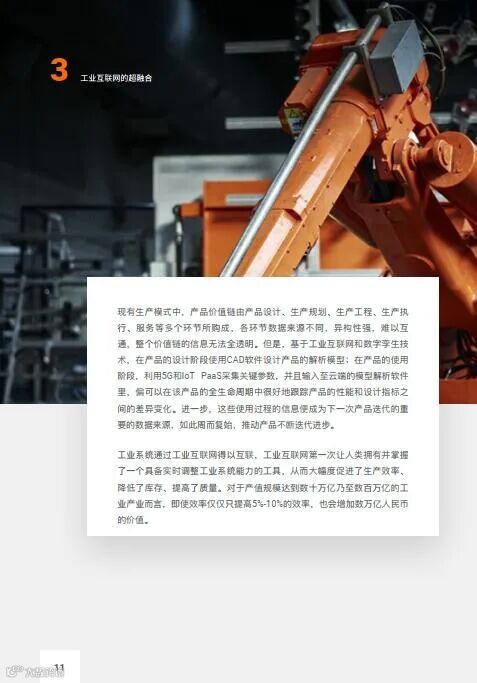 【趋势概要】5G、IoT设备、云计算、边缘计算的迅速发展将推动工业互联网的超融合,实现工控系统、通信系统和信息化系统的智能化融合。制造企业将实现设备自动化、搬送自动化和排产自动化,进而实现柔性制造,同时工厂上下游制造产线能实时调整和协同。这将大幅提升工厂的生产效率及企业的盈利能力。对产值数十万亿乃至数百万亿的工业产业而言,提高5%-10%的效率,就会产生数万亿人民币的价值。