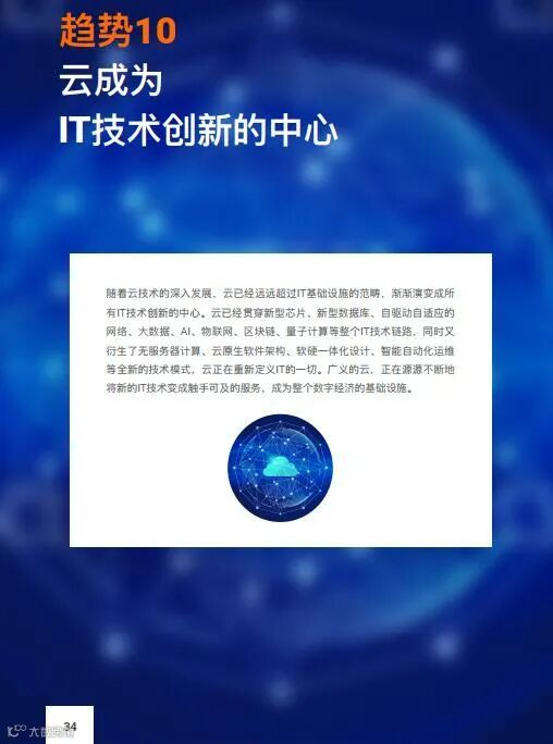 【趋势概要】随着云技术的深入发展,云已经远远超过IT基础设施的范畴,渐渐演变成所有IT技术创新的中心。云已经贯穿新型芯片、新型数据库、自驱动自适应的网络、大数据、AI、物联网、区块链、量子计算整个IT技术链路,同时又衍生了无服务器计算、云原生软件架构、软硬一体化设计、智能自动化运维等全新的技术模式,云正在重新定义IT的一切。广义的云,正在源源不断地将新的IT技术变成触手可及的服务,成为整个数字经济的基础设施。