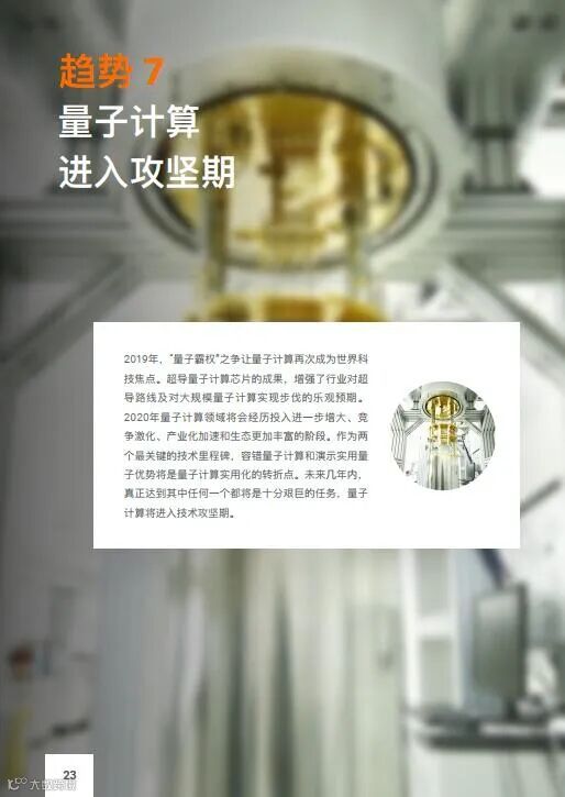 【趋势概要】2019年“量子霸权”之争让量子计算在再次成为世界科技焦点。超导量子计算芯片的成果,增强了行业对超导路线及对大规模量子计算实现步伐的乐观预期。2020年量子计算领域将会经历投入进一步增大、竞争激化、产业化加速和生态更加丰富的阶段。作为两个最关键的技术里程碑,容错量子计算和演示实用量子优势将是量子计算实用化的转折点。未来几年内,真正达到其中任何一个都将是十分艰巨的任务,量子计算将进入技术攻坚期。