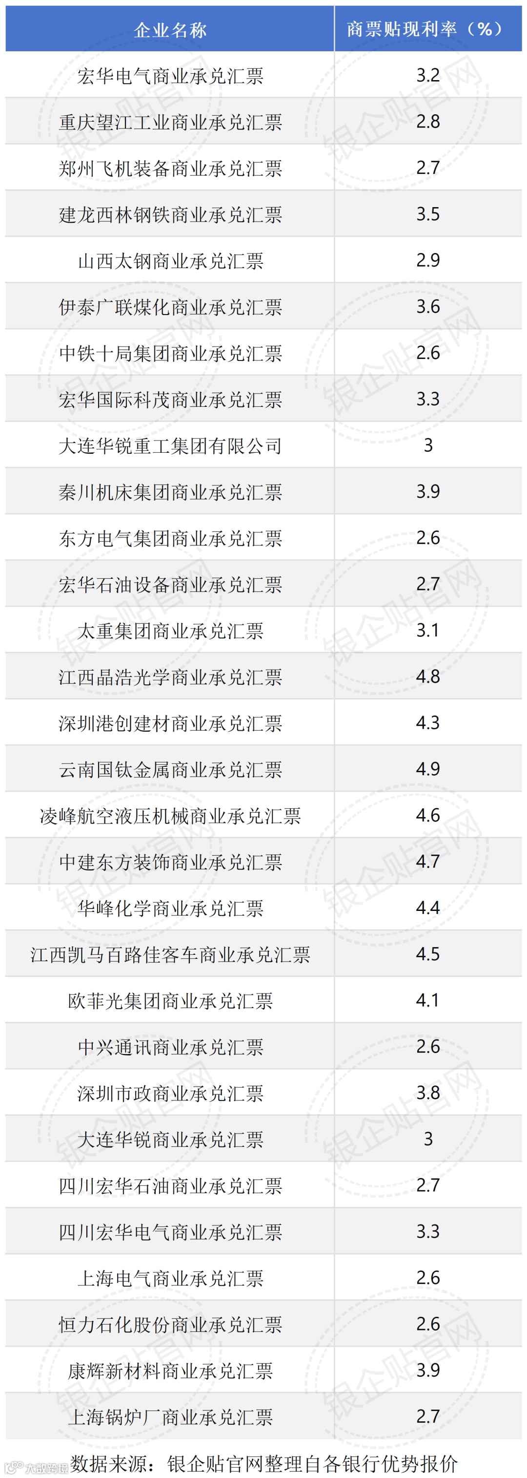 大企业的商票(如东方电气、上海电气、中铁建)贴现利率能低到2.6%左右