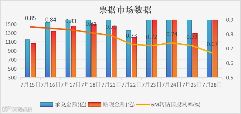 今日(7-28)票据市场呈现显著的利率下行趋势,资金面净投放提振机构配置情绪,短期票据贴现利率下探幅度尤为明显。伴随月末临近,企业贴现需求高位运行,票据供需错配使贴现成本加速下降。