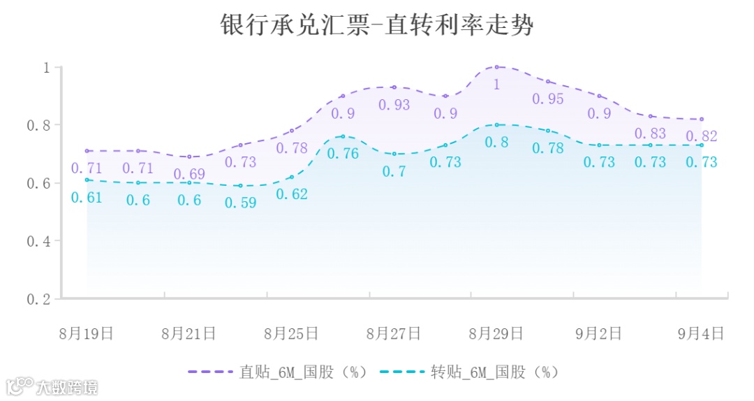 直贴市场供给逐步回升,一级签发量恢复至千亿规模,卖盘力量有所补充。需求端保持稳定,部分直贴行小幅下调报价,带动整体利率震荡小降。今日银企贴报价显示:国股银行半年期0.84%、大行半年期0.93%、整体来看,短期票价依旧高于长端,反映了资金面对年内票的谨慎态度。