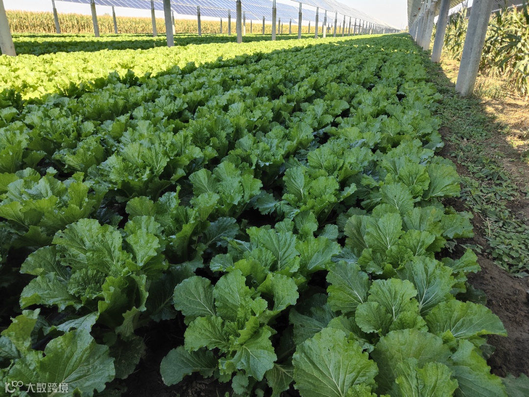 走在田间的小径上,脚下是松软的泥土,两旁是郁郁葱葱的白菜。这些白菜叶片宽厚,色泽鲜亮,它们在光伏板的庇护下,享受着充足的阳光和适宜的