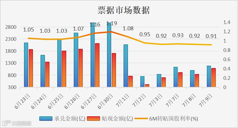 今日(7月9日),承兑汇票转贴现市场交投活跃:承兑金额达1172.34亿元;贴现金额达1076.18亿元;银票转贴交易量为936亿元。
