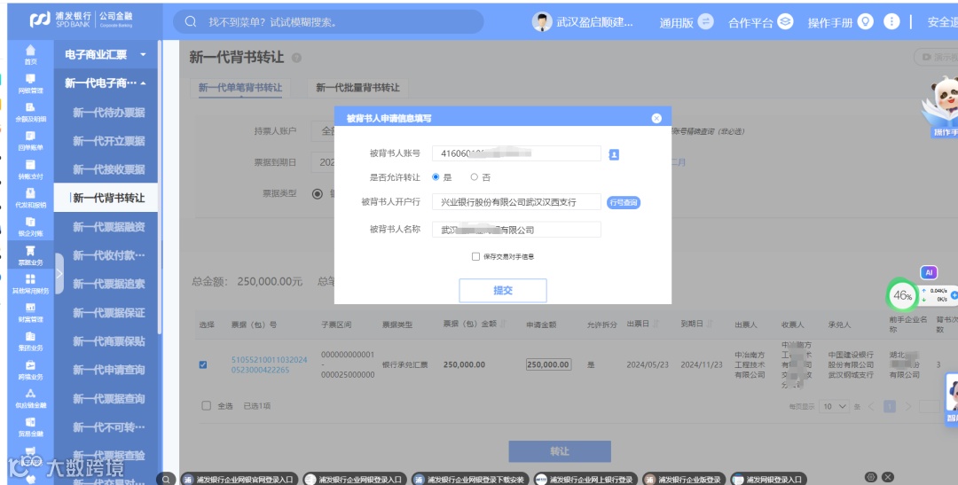 在使用浦发银行企业网银进行新一代承兑汇票背书转让时,流程非常简便,但需要严格按照步骤操作以确保顺利完成。以下是具体的操作步骤: