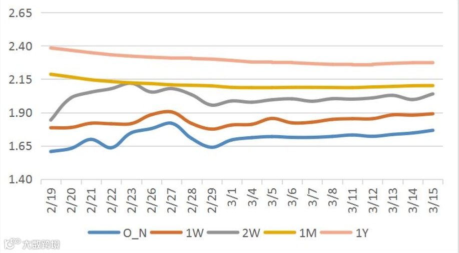 3月15 日,为维护银行体系流动性合理充裕,人民银行以利率招标方式开展了130 亿元7 天逆回购和 3870 亿元 MLF 操作,中标利率分别为 1.80%和 2.50%,较之前持平。因今日有 100 亿元逆回购操作到期和 4810 亿元 MLF 到期 ,当日实现净回笼 910 亿元。