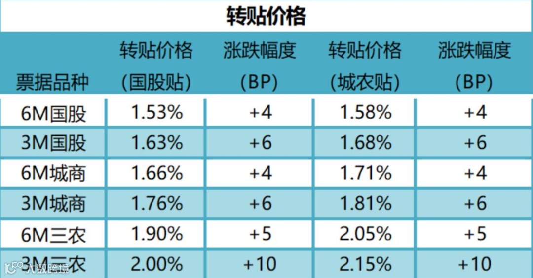 今日直贴行报价延续上调,其中 3M 票价上调 5-10BP,6M 票价上调1-5BP,买盘配置意愿相对温和。供需博下,票价震荡上涨。。