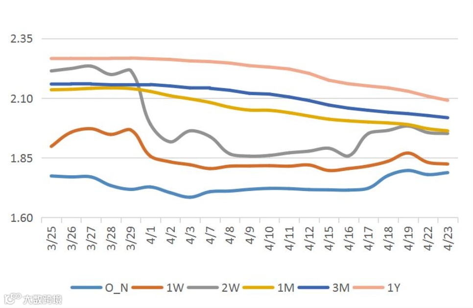 4月 23 日,人民银行以利率招标方式开展了 20 亿元7天逆回购,中标利率为1.80%,较之前持平。因今日有 20 亿元逆回购操作到期和 700 亿元国库现金管理到期,当日实现净回笼 700 亿元。