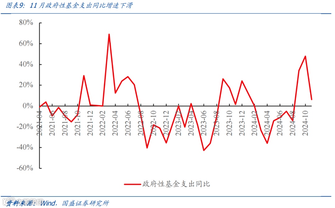 11月财政支出力度边际放缓,多项基建支出同比下降,并且政府性基金支出增速也明显下滑。11月单月一般公共预算支出同比增长3.8%,前值为10.4%,1-11月,财政支出累计同比增长2.8%,前值为2.7%。11月基建支出同样边际放缓,同比增长9.8%(10月达29.3%),除农林水事务仍维持较高增速(23.3%),其他分项增速均较低或为负。另外,由于今年新增专项债在1-10月已经基本发行完毕,11月政府性基金支出增速也明显下滑,11月同比6.3%,10月同比47.9%。