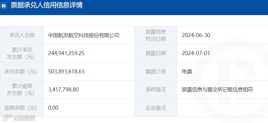 航发科技商票累计承兑金额24.4亿,当前无逾期,兑付信用较好,该数据来源票交所权威披露。