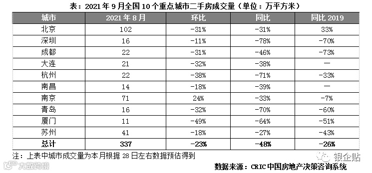 2021年9月,二手房市场成交量持续回落,且回落速度呈加快趋势。数据显示,十个重点城市九月二手房成交总面积为337万平方米,环比再降23%。为维护二手房市场稳定,多个热点城市正积极调控,频频出台“二手房指导价”、“信贷收紧”等政策,但整体行情依旧处于持续降温中。