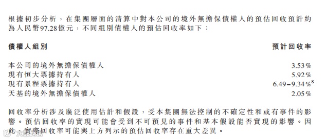 若重组不成功导致中国恒大被迫清算,预计回收率如下: