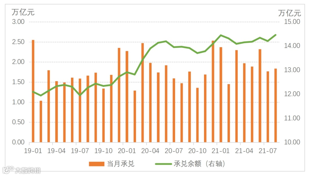 8月末,承兑余额14.46万亿元,同比增长3.51%;当月承兑1.84万亿元,同比增长24.55%。1-8月,累计承兑15.91万亿元,同比增长7.87%。其中,银票承兑13.43万亿元,同比增长7.15%;商票承兑2.48万亿元,同比增长11.99%。