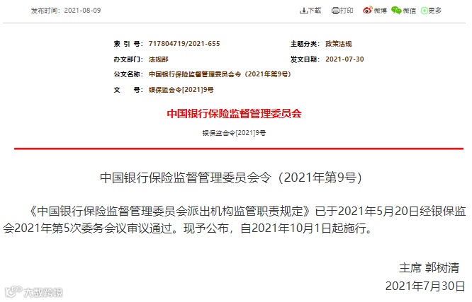 刚刚,中国银保监会制定了《中国银行保险监督管理委员会派出机构监管职责规定》(以下简称《规定》),自2021年10月1日起实施。