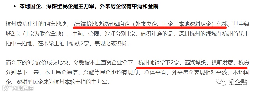 本次成功出让的14块地中,有9宗底价成交地块被本土国资企业拿下,同时,深耕杭州的绿城也拍得2宗地。本地国企与深耕型民企为杭州二轮土拍主力军,为政府托底护航。