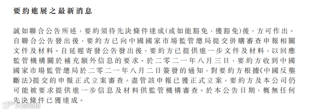 2021年8月6日,SOHO中国(00410.HK)发布公告称,与黑石集团236亿港元的交易,获市场监管总局正式立案审查。