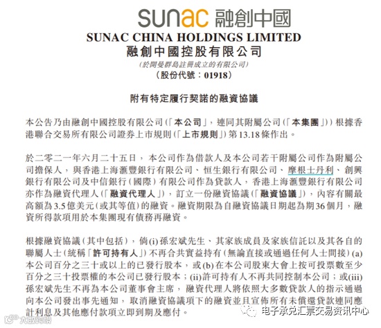 融创中国(27.3, -0.15, -0.55%)(01918.HK)发布公告,公司作为借款人及本公司若干附属公司作为附属公司担保人,订立一份融资协议,内容有关最高额为3.5亿美元(或其等值)的融资。融资期限为自融资协议日期起为期36个月,融资所得款项用于本集团现有债务再融资。