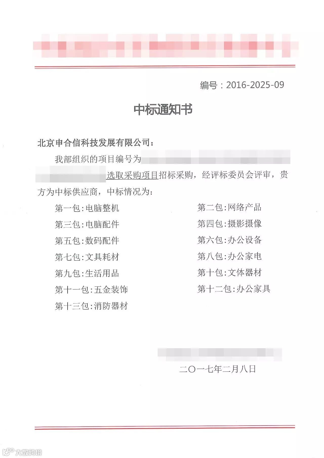 2017年2月8日,申合信科技成功中标某网上采购商城。采购项目包含网络产品,办公设备,文具耗材等。