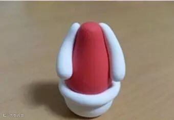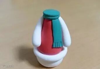 用红色粘土制作雪人身体。身体部分不是圆球了,而是一种类似不倒翁一样的圆锥体造型,为了使雪人不倒,在身体底部用白色粘土做一个相对稳定的底座。