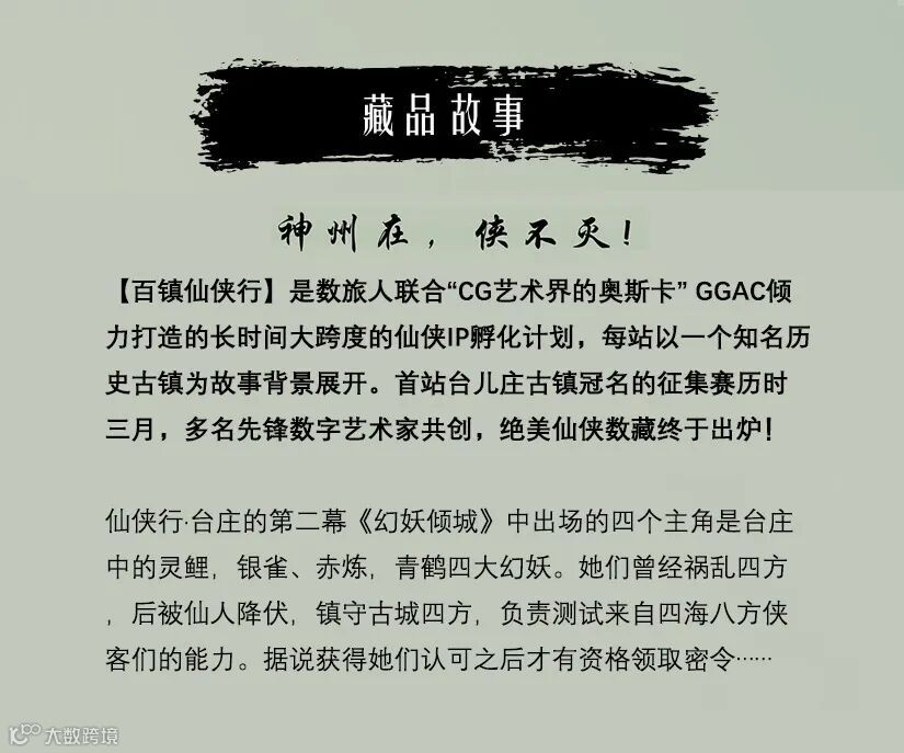 -已签约多家博物馆、景区、艺术家和知名IP,并联合顶尖数字艺术创作平台持续打造“百镇仙侠行”、“大美河山”等系列专题。